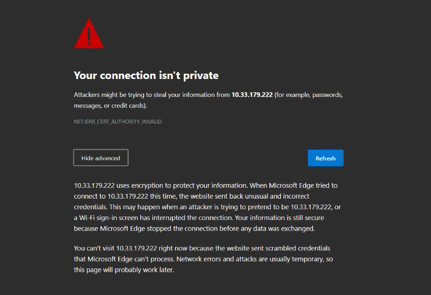 IF you are using Chrome web browser, you may receive a security warning stopping you from accessing the device because it is not a website, it does not provide the same security assurances normal sites would. This is normal for any device you would be remotely logging into via its IP address