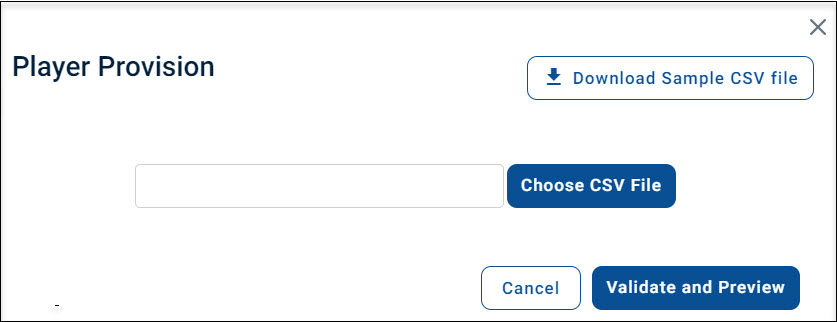 In the Bulk Player Provision Window in Korbyt, click Choose CSV File in the Player Provision Pop-up to upload your updated CSV File