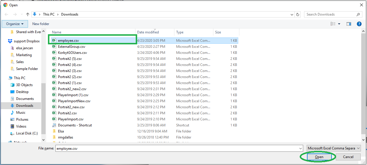 If you include any user attributes in your CSV import file that are not defined in your Korbyt Anywhere settings, such as Department and Location, your file will still load but those attributes will be ignored. Back in Korbyt, click on Select CSV File link to select the file