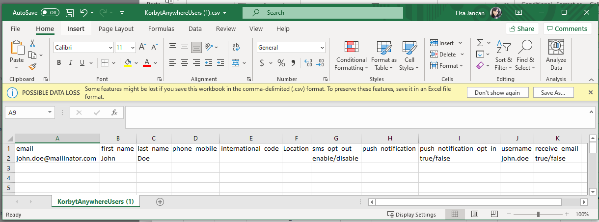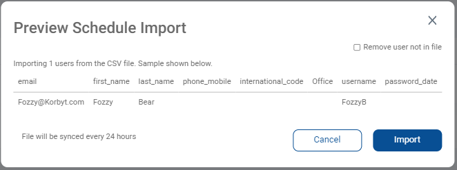 If you include any user attributes in your CSV import file that are not defined in your Korbyt Anywhere settings, such as Department and Location, your file will still load but those attributes will be ignored.