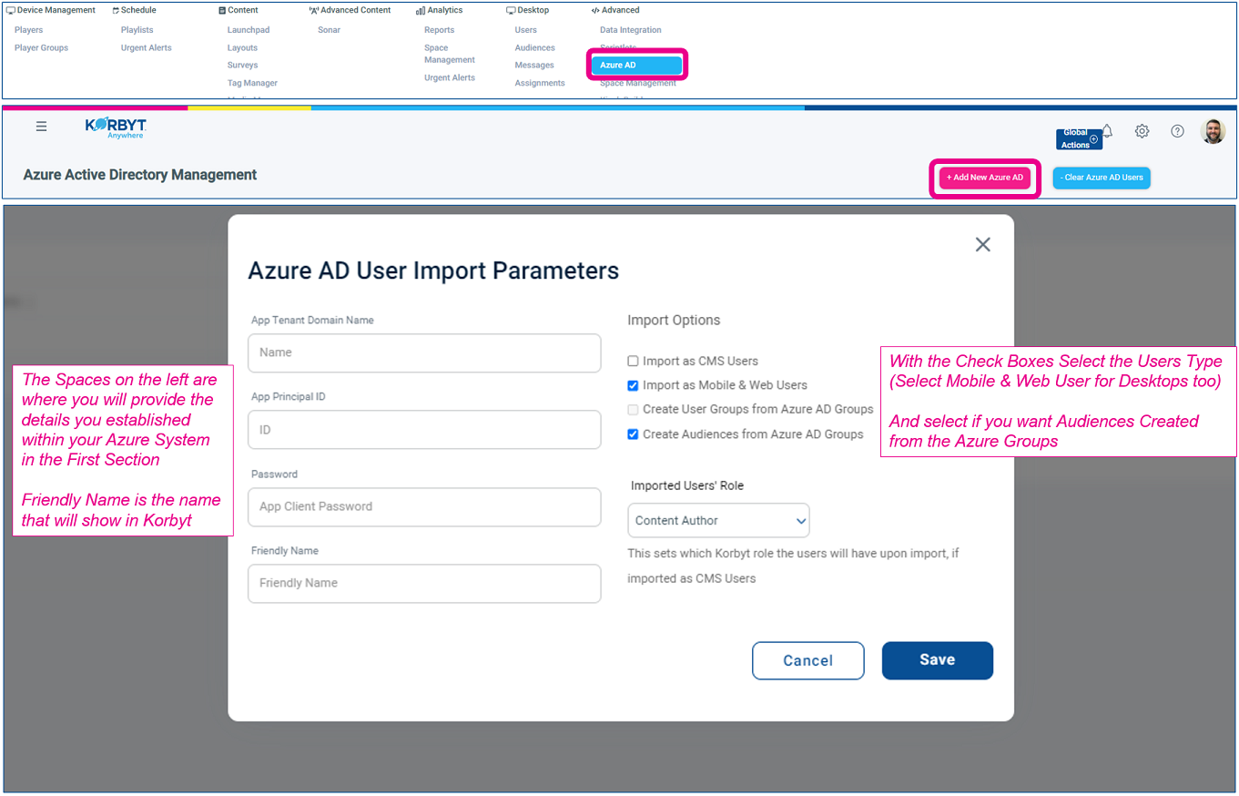 and/or Desktop or Mobile user for each employee it detects in the customer’s designated Azure groupsIn Korbyt – Enter User Import Parameters