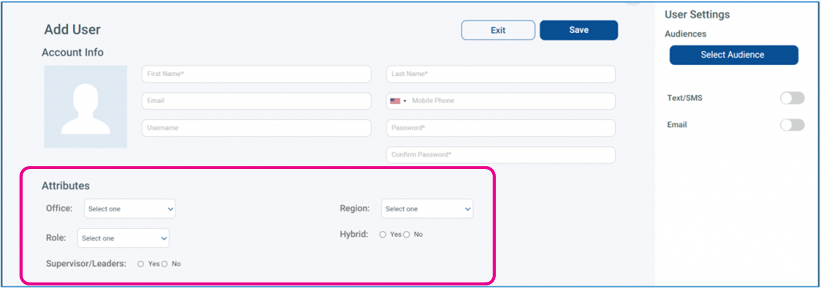 Audience Membership is how specific messages are targeted to a group. It can be set when creating a single user or managed later in the Audience menu