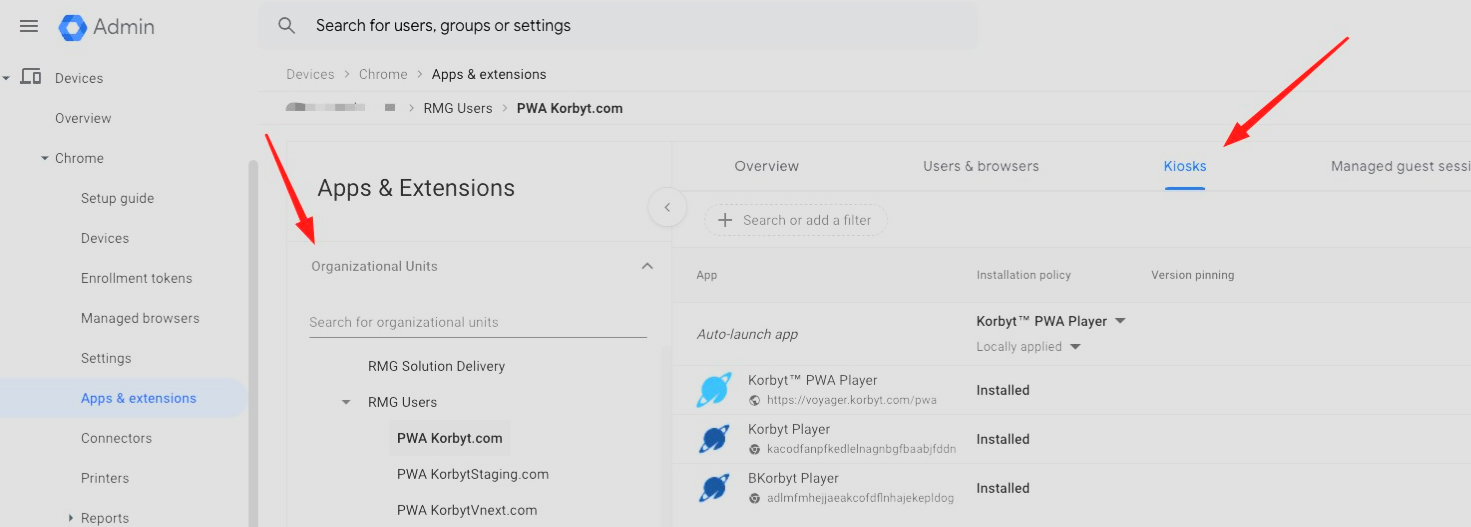 • Select the Organization Unit that needs the Korbyt Player, and then select the Kiosks Tab