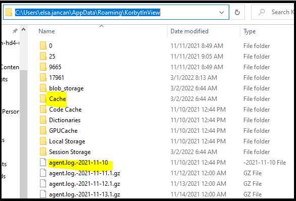 “userprofile/AppData/Roaming/KorbytInview” this path contains both the folder for Cache and the list of all the agent logs