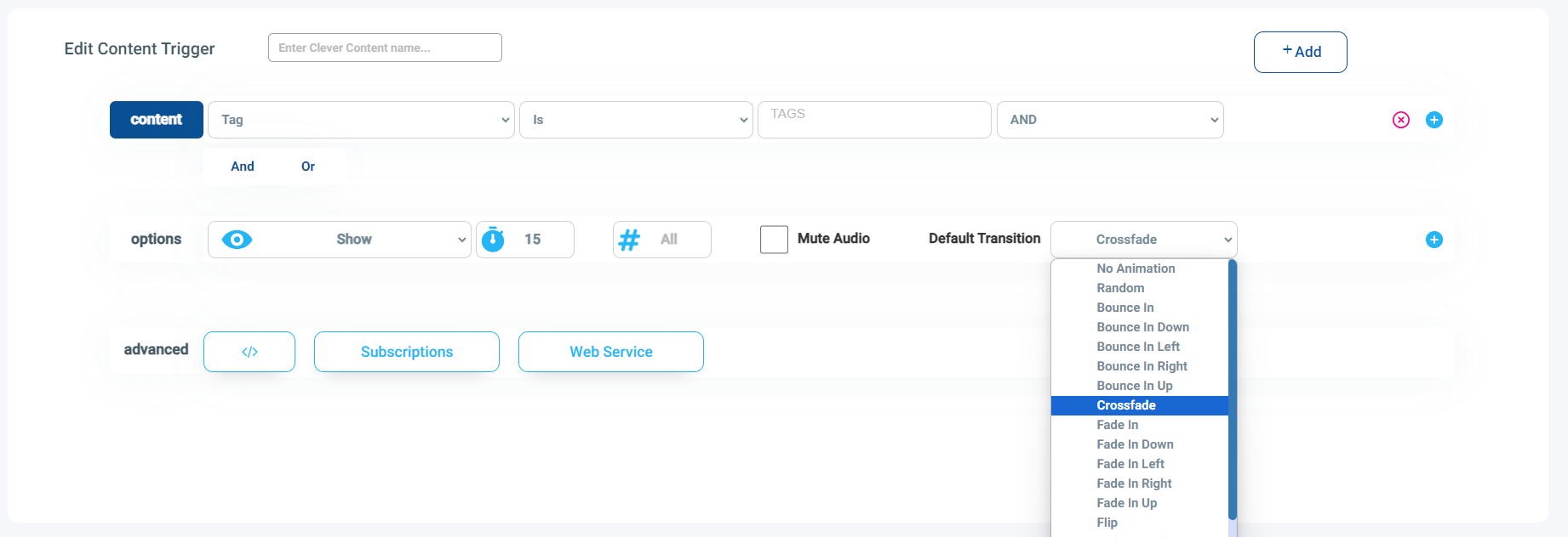When creating the Clever Trigger (Rocket ship) or editing the Clever Trigger (Lightning Bolt) there is an options section that includes the Transition for each item in this specific rule