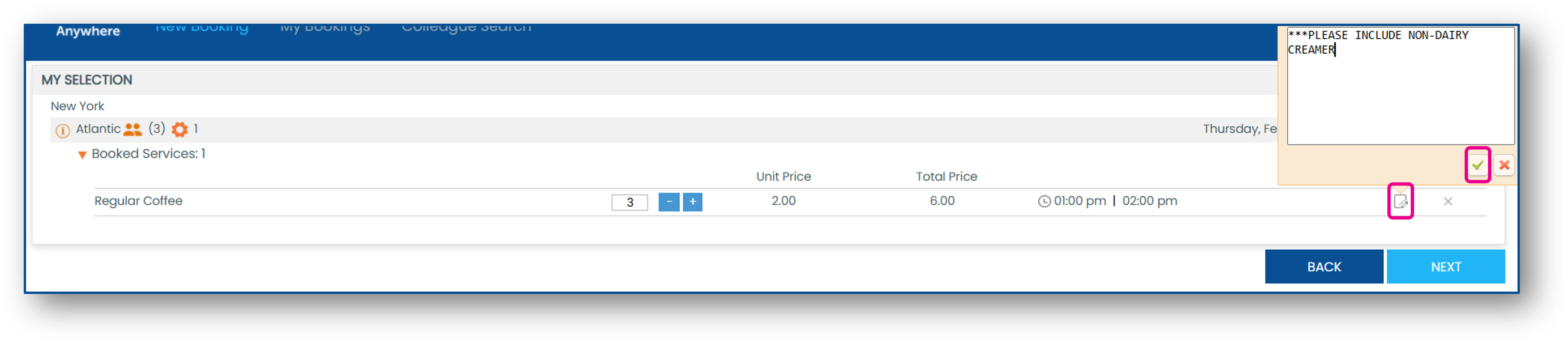 You can add a note to your service item(s) by clicking the notebook icon once they are added to your booking